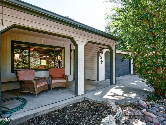 Welcome to 645 Dragonfly Dr., Prescott, AZ! Nestled in Yavapai Hills, this charming home backs up to a serene wooded open space with a seasonal creek. Inside, wood accents and a cozy gas fireplace create a warm ambiance. The open dining area is adjacent to the kitchen, while a bright Arizona room with large windows offers peaceful views of the backyard. Both bedrooms feature ensuite bathrooms for privacy. The front yard is beautifully landscaped with a covered patio, and the private backyard includes a partially covered deck. Lease solar with low payments adds efficiency. Don't miss this unique setting!