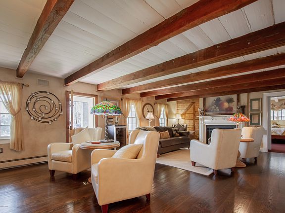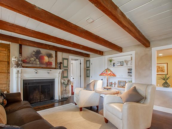 - RoomLivingRoomFeatures: Dec Molding, Floor - Wood, Fireplace - Woodburning, Built-Ins, Ceilings - Beamed