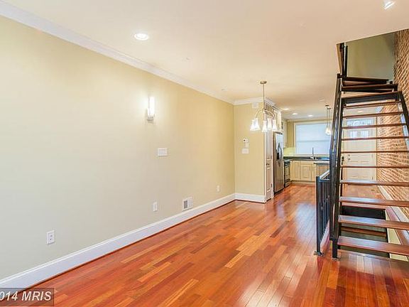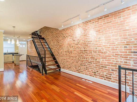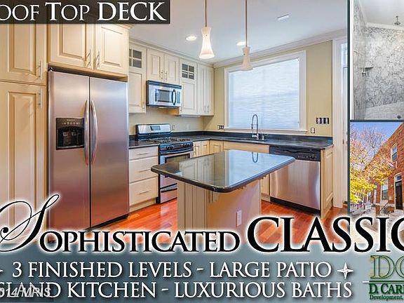 SOPHISTICATED ROWHOME WITH 3 FINISHED LEVELS AND ROOFTOP DECK! Hardwood floors, crown molding, & exp brick throughout upper levels, spacious living room, island kit w/ granite counters & ss appliances, open riser stairs, 2nd level w/ 2 large bedrooms & 1 full bath w/ dbl vanities & oversized shower, finished basement w/ bedroom & full bath w/ vessel sink, & rooftop deck with sweeping city views!