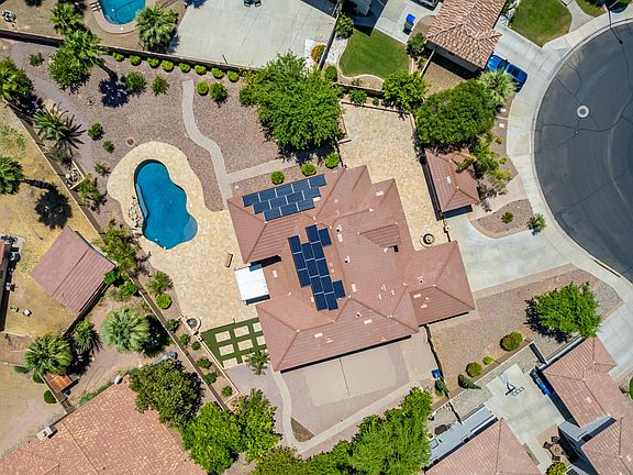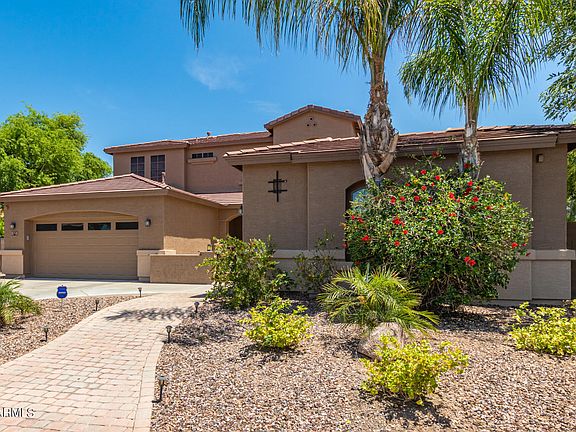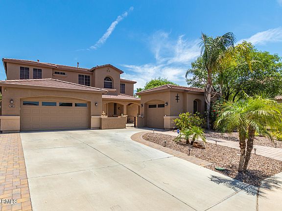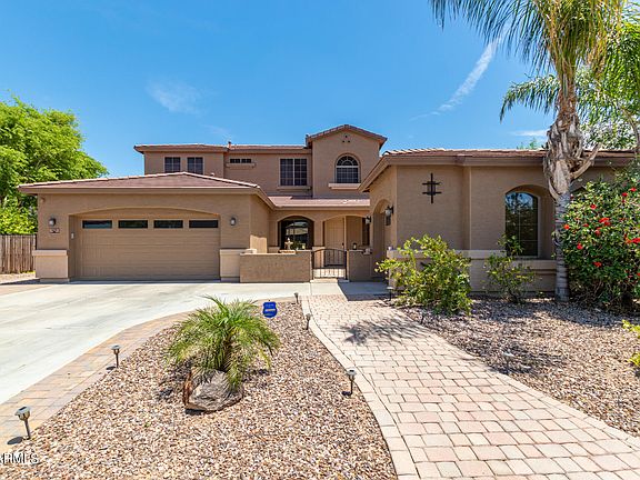 Executive Style Home in the popular community of Campo Verde .Architecturally & Aesthetically pleasing with incredible 19,266 sq.ft. Entertainer's dream backyard with Pebble-tech salt water, waterfall pool, pergola, fountain, sport court, fruit and spice trees. Gourmet island kitchen with cherry cabinets with crown molding, granite counters, glass backsplash plus top of the line appliances, electric range plus gas line! Private master suite with stairs to upstairs sitting room/den with French doors to patio, and luxury bath with walk-in closet! Wood laminate and porcelain tile floors! Private charming paver courtyard! Dream laundry room with cabinets, utility sink and backsplash! EV charging socket ( 220V) in garage! Truly the finest contemporary home available in Chandler under $1M 1. Reverse osmosis 2. Cooktop - electric and ready with Gas line available 3. Gravel and travertine stone pavers at back 4. Home warranty - fidelity national