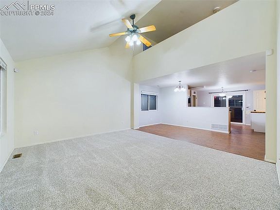 This bright and inviting home is nestled in the highly desirable Ridgeview at Stetson Hills community, where scenic walking and biking trails offer breathtaking views of the Mountains. The open floor plan is highlighted by soaring vaulted ceilings, brand-new carpet throughout, and a modern kitchen complete with kitchen appliances and a central island. The great room, with its impressive vaulted ceilings and large picture windows, perfectly frames the beautiful neighborhood scenery and flows seamlessly into the dining area, creating a welcoming space for family gatherings and entertaining. The kitchen is designed for both function and style, offering plenty of cabinetry, a combination of stainless steel and black appliances, and a central island for extra prep space. Sliding glass doors lead out to a composite deck overlooking a fenced yard, ideal for pets and outdoor enjoyment. Upstairs, an open staircase leads to the master suite, featuring a walk-in closet and full bath. An additional bedroom and a versatile loft space provide options for an office, playroom, or additional living area. Additional highlights of this home include central air conditioning, ceiling fans, a main-level laundry room, vinyl windows, and an attached garage. Conveniently located near military bases, top-rated District 49 schools, parks, and the bustling Powers corridor with its variety of shopping and dining options, this home combines comfort with stunning views. Don’t miss the opportunity to make this charming property yours!