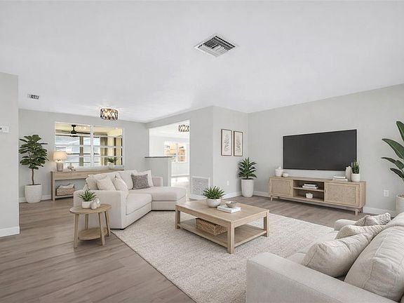 One or more photo(s) has been virtually staged. Welcome home! This beautifully fully renovated corner home offers 2 bedrooms, 2 bathrooms, and over 1,500 sq. ft. of modern open concept living on a single story for comfort and convenience. With brand new updates throughout, this home is designed for stylish, easy, and low-maintenance living. Inside, the layout flows smoothly through a bright and spacious living and dining area filled with natural light. Just off the main space is a versatile flex room, perfect for a home office, playroom, or additional lounging. Brand-new luxury white oak–washed vinyl flooring runs throughout the home, adding durability, warmth, and an elevated designer feel. The sleek modern kitchen features granite countertops, stainless steel appliances, a brand new dishwasher, extended counter bar seating, and generous cabinet storage with soft close features. Both bathrooms have been tastefully redesigned with floor to ceiling tile, modern spa like fixtures, granite countertop vanities that have abundant storage and soft close cabinetry. The two spacious bedrooms provide comfortable retreats, each offering ample closet space and room for customizing your ideal setup. Step outside to enjoy indoor and outdoor living on the private covered lanai or on the open patio, ideal for entertaining, gardening, or unwinding. Additional highlights include a 2-car garage with a dedicated laundry area, ample closet space throughout, and major system updates for peace of mind including a newer roof (2020) and water heater (2024). This home is located in Flood Zone X, and there is no HOA or CDD. This modern, light filled home is move-in ready. Perfectly located near Downtown New Port Richey, shopping, dining, schools, hospitals, and major highways. Take advantage of a no cost appraisal when partnering with our preferred lender. Schedule your private showing today!