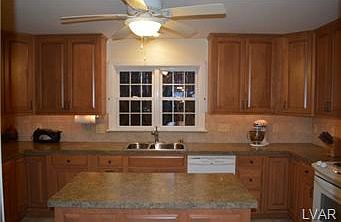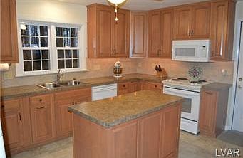 This warm and cozy Cape Code is located in the ever popular Southern Lehigh SD and is truly in move-in condition. Just some of the recent updates in this home include a custom kitchen with 42" cabinets, soft close drawers, center island, and built-in pantry. Refinished gleaming hardwood floors throughout most of the home. Newer windows, roof, h/w heater and heat pump. Finished basement with bar, electric fireplace, new half bathroom and utility room. New main bath with ceramic tile. Spacious master bedroom with custom closet. Central A/C. Tranquil deck and covered patio overlooking the large and private tree lined back yard adorned by foliage. Utility Shed. Oversized two car garage with built-in workbench. You won't be disappointed!