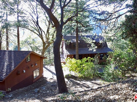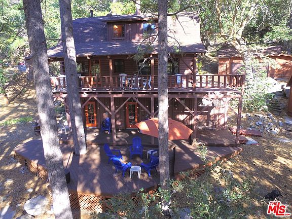 This unique log cabin sits on over 1.6 acres and is on a very secluded wooded hillside, making it the perfect getaway. Four bedrooms & three bathrooms make this a great family retreat. The main (middle) level features a large living room w/gorgeous wood burning stove, kitchen with stainless steel appliances, JennAir range top, and granite counter tops, a dining area with table that seats eight, a 3/4 bathroom, and it has access to a large wooden deck. The upper level features three bedrooms and a full bathroom. The lower level features a large bedroom with a half bath, and a bonus room, currently set up with bunk beds and a TV. There's outside access from the main and lower levels so you can really enjoy the summer months outdoors. There are three stoves in the cabin so you'll be nice and cozy during the winter months. There are several hiking trails in the area and Big Bear and Sugarloaf are just 30 miles away. This home is being sold furnished so please ask the LA for inventory list.