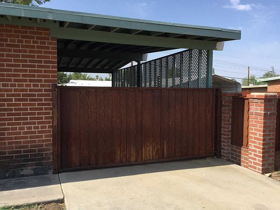 The classic Terra Del Sol red brick ranch home. Wonderful large yard with block and custom metal fence, 2 over-size custom metal gates for access and gated carport plus additional covered parking inside backyard. Tile floors in main areas, new carpet in bedrooms, kitchen has been updated from original with maple cabinetry, stainless steel refrigerator and glass top electric stove. Windows replaced with dual pane windows throughout. Arizona room makes a great den and laundry room is also inside and includes front load washer and dryer. Clean and move in ready.
