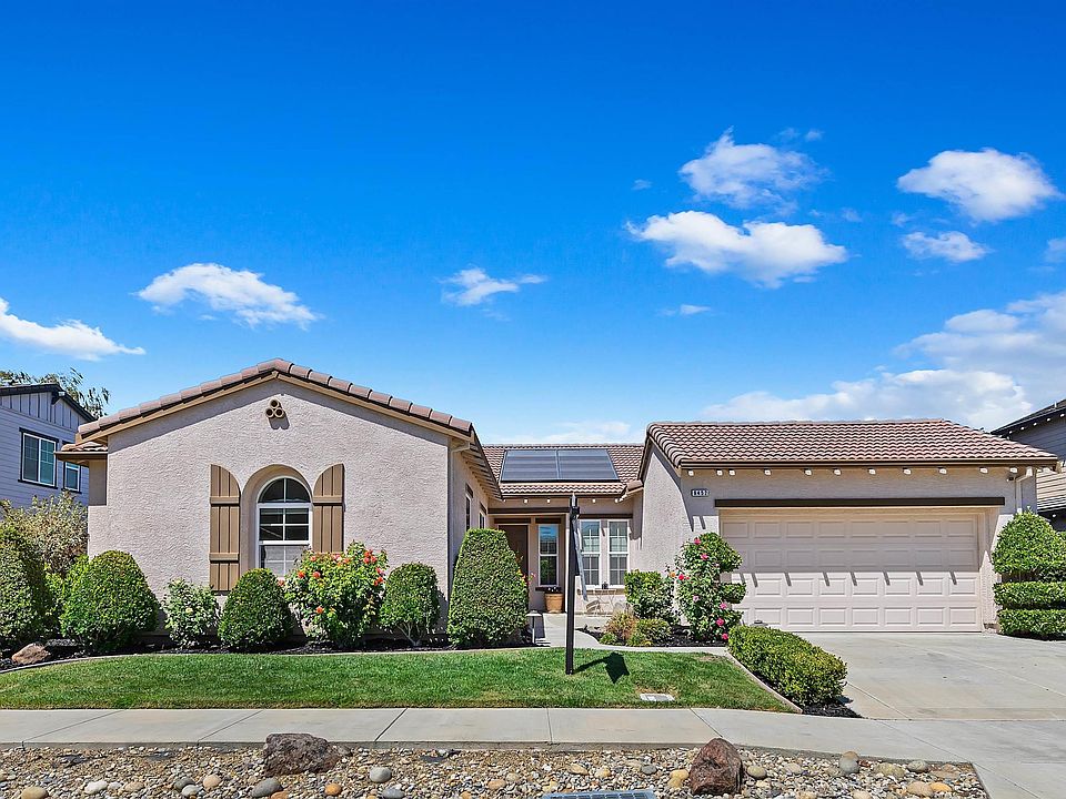 Do not miss this 1 OWNER ONE STORY BUILT IN 2012 with NO HOA! From the minute you step inside the SOUTH FACING front door you will appreciate the 10 foot tall ceilings and wide hallways. The spacious and bright interior features a modern style floor-plan with a formal dining room and large great room and offers 4 BEDROOMS + OFFICE. Chef style kitchen with granite counters, island, gas range, pantry, and stainless appliances. Interior upgrades include brand new neutral carpet, LED recessed lights, crown molding, OWNED ELECTRIC SOLAR, extensive custom garage cabinetry, and built-in speakers. Fully landscaped yards with large patios, grass area and storage shed. WASHER/DRYER AND REFRIGERATOR INCLUDED!