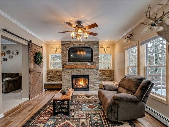 The Living Room: Features a cozy propane fireplace with a stunning custom stone-tiled hearth, perfect for warming up after a day on the trails.