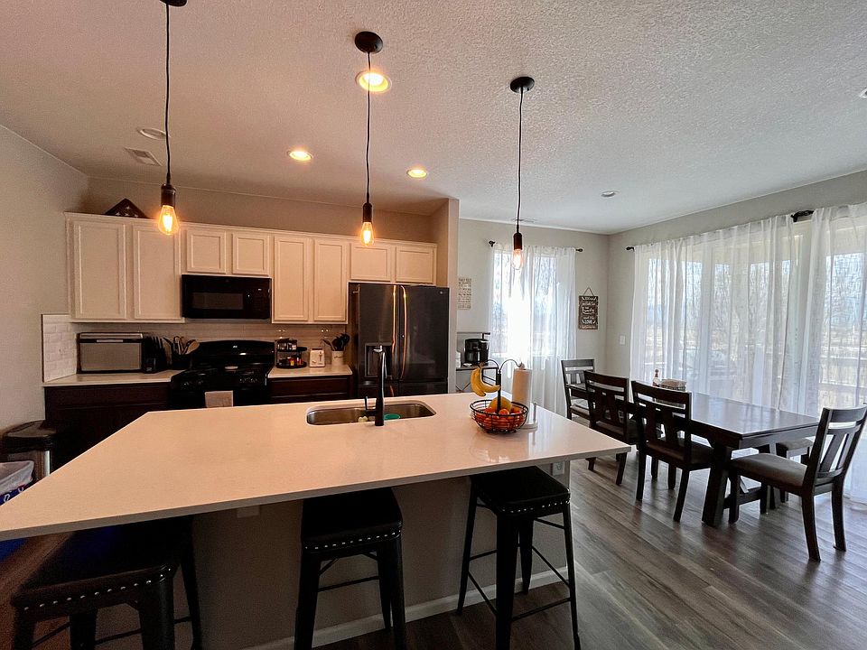 One circle family friendly subdivision on the North side of town near Powers and Dublin. We are a 15 minute drive to the Air Force Academy or Peterson Space Force base. Quiet, safe neighborhood with all new homes built in 2021 and after. One bedroom and full bath (MIL suite or great for an older teen) with a walk in shower on the 1st floor. Combined first floor open living/dining/kitchen space with deluxe large island, dovetailed cabinets with slide out storage drawers on the lower shelves. Large LG stainless steel refrigerator with a secondary fridge in the garage that we can leave if you like. Tuxedo cabinets, quartz countertops, waterproof vinyl matching flooring throughout and a beautiful Cheyenne Mountain view off the patio. Plenty of natural light with floor to ceiling windows and sliding glass doors that open to the back covered patio. Natural gas connection to link to your bbq if you bring one. Under home storage spanning the entire space of the house with a ladder down to the crawl space hidden in the front coat closet floor. Laundry upstairs with washer and dryer for your use. Three bedrooms upstairs, one down with a full bath with tub/shower combo on the second floor. Large size master with large walk in closet and an en suite bathroom/walk in shower. Sitting window in extra bedroom upstairs. Both upstairs bedrooms (not the master) have sliding closet doors . Close to grocery stores, churches, restaurants, LifeTime Fitness and Villa Sport gyms nearby, as well as several hospitals. Within about 45 minutes from Denver. D49 schools with elementary, middle and high schools within 1 mile of the home. Security deposit is equal to one month's rent, application is required for each person 18 years and older in the home and pet deposits will be required. Approval is contingent upon passing background/credit check, income/rental history verification. We are currently in the home. Call to schedule a showing.