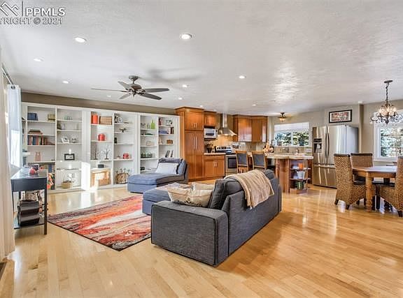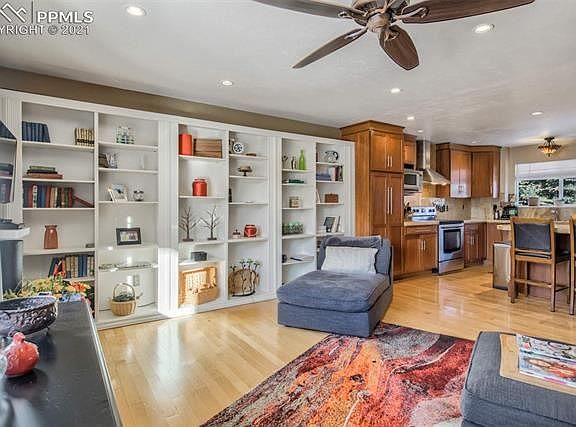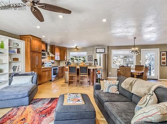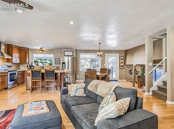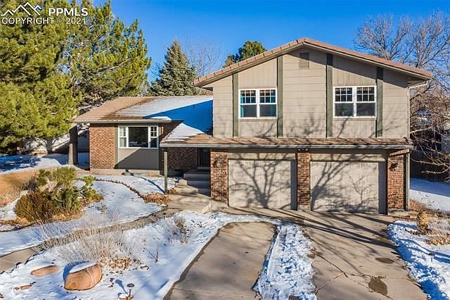 Open, bright, and beautifully updated 4 Bedroom, 4 Bath home in desirable Northwest -Golden Hills neighborhood & D-20 Schools. This home is truly move-in ready and sure to impress! Main level has living room that is open to the kitchen and dining area. Gorgeous maple wood floors on main level w/ built-in contemporary book shelves and a large picture window with mountain and Pikes Peak views. The living room is open to a fabulous kitchen with maple cabinets, stainless steel appliances, large kitchen island with seating, and granite tile counter tops. The dining area walks-out to a large wood deck off the main level. The lower level has hickory floors, a large family room w/ fireplace with custom tile surround, mantle and built-in shelves, a walkout to a concrete patio area, the guest bath, and entrance from the garage is also on this level. Upstairs is the master bedroom plus two additional bedrooms, an updated full bath, and the master has its' own updated master bath, walk-in closet & cozy private deck. The basement has a second large family room which is the third large living space in the home, the fourth bedroom, the updated fourth bathroom, and the laundry/utility room. Features include A/C, ceiling fans, vinyl windows, tile roof, gutter guards, large fenced yard backing to a neighborhood common area, mountain views, privacy, great outdoor living spaces, and you'll love being steps away from a neighborhood walking trail, a short walk to Golden Hills Park, and close to Ute Valley Park for hiking & biking! Quick access to I-25 and the Woodmen/Academy corridor for shopping and restaurants. Welcome home!
