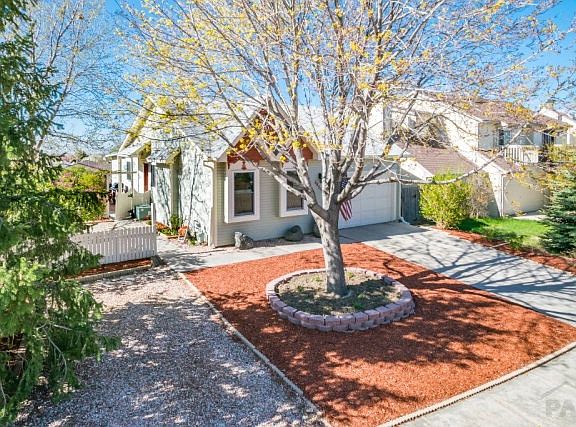 Welcome to this truly lovely home with modern updates. The master has an attached bath with beautiful dark cabinets and brushed nickel touches throughout the entire home. The secondary bedroom has splendid large windows (with cellular shades) and also has an attached bathroom with elegant and modern updates. The kitchen has new slate tile backsplash, a pantry, and garage entry. The one car garage is oversized with a bump out and a built-in workbench and cabinets. The living room has vaulted ceilings creating a light and airy space. The living room is attached to a magnificent sunroom that faces Pikes Peak. The sunroom has an incredibly large storage room attached making it the perfect space for an office, work out area, or family room. The sunroom has a walk out with a new sliding glass door leading to a quaint paver patio. The landscaping for this property is delightful. The front yard is xeroscaped and the backyard-paved patio is the perfect place to kick back and relax with a view of Pikes Peak.
