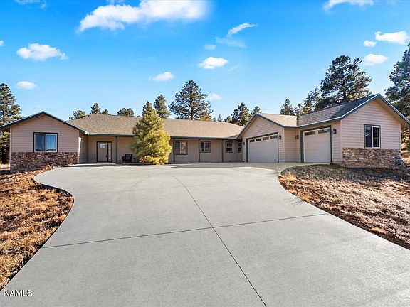 Stunning views, of the San Francisco Peaks, this, beautiful newer 4 bedroom 2.5 bath home with 3 car garage has luxury vinyl plank flooring throughout. One bedroom is currently being used a furnished office. Vaulted cedar ceilings in great room and primary, Knotty Alder cabinets, Quartz in kitchen. Great MUD room with custom cabinets.. Home borders National Forest.