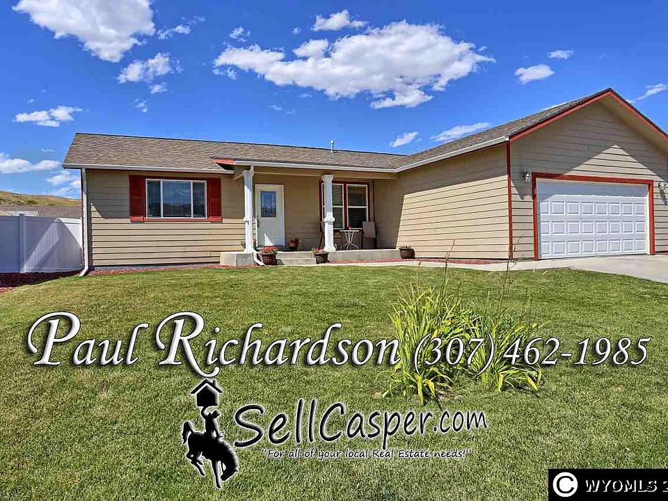 Built in 2007, this ranch style home offers 5 bedrooms, 2 bathrooms, main floor laundry, a 2 car garage, bonus storage room, plus room downstairs to add an additional bathroom. 2992 total square feet, Large backyard patio and clubhouse, central heat and air conditioning, architectural shingle roof and custom paint scheme throughout. For your personal tour, call Paul Richardson at 307-462-1985.