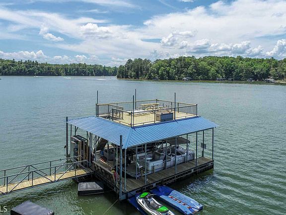 One of the most distinctive, unforgettable homes on Lake Lanier! Builder's own showcase on a point lot w/ jaw-dropping sunset views year-round! Very close to water's edge on all sides, short steps to very deep water dbl slip party dock. Stunning gourmet kitchen, soaring vaulted wood ceilings w/ rustic beams and other architectural details. Open floor plan, shaved log columns, stone fireplaces & more. Magazine-quality master suite on main has its own office w/ fireplace. Terrace has wet bar, theater, gym, 2nd master suite. But it's THE VIEWS that will take your breath away.