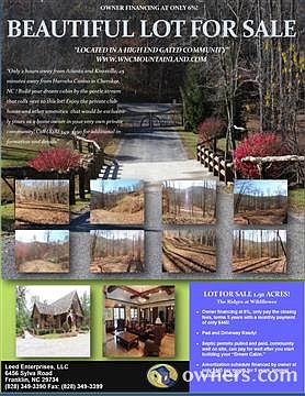 Vacant Lot or Land for sale by owner in Franklin, NC 28734. Beautiful mountain lot next to gently rolling creek with mountain view located in Franklin, NC 28734, owner financing!!! Payments with interest are $445 per month for 5 years. Buyer is responsible for closing fees. Lot is located in a high end gated community called, The Ridges at Wildflower. Lot is pad ready and septic permits are pulled, community well hook up on site, does not need to be hooked up until needed. Great location to build your dream cabin, great location: 2 hours north of Atlanta, 2 hours east of Knoxville, 1 hour south of Asheville, NC and only 30 minutes away from Harrahs Casino in Cherokee. Call Gary at 828-349-3390 for more information.