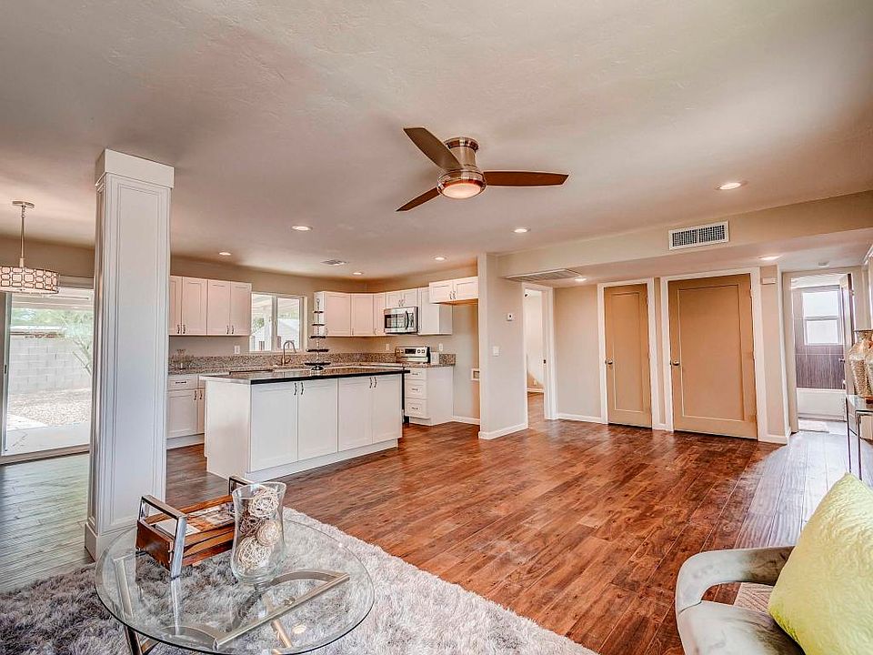 An amazing 4 bedroom, 2 bath home with a beautiful remodel. Kitchen is fully remodeled with granite counters, oversized quartz island, upgraded stainless steel appliances and new white shaker cabinetry. The floor plan encompasses a great room that flows into the backyard, perfect for entertaining. Everything New: bathrooms, wood flooring, baseboards, doors, dual pane windows New Roof and New HVAC. Perfect for any family. Wheeler elementary, Tierra Del Sol Aquatic club and parks are just a few blocks away. Owner/Agent