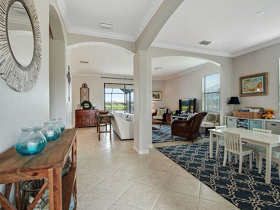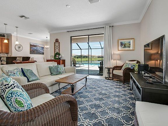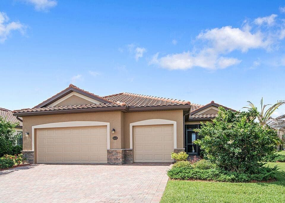 The Sanctuary in River Strand is where it's at! Like-new manor home on a premium lakefront lot. Maintenance free. Gated. Open floor plan. Crown moldings. Spotless. Abundant kitchen. Morning room with water views. 50' X 45' lanai with travertine pool deck and 30' X 15' heated saltwater pool with six arching streams water feature. Screened, paver front porch Oversized 3 car garage with shelving and attic. Nestled within the 2500 acre Heritage Harbour master-planned community in East Bradenton. Social amenities included in HOA: lagoon pool with cabanas and grilling area; pickleball; tennis; fitness; walking trails. Golf is not included but available to you. Right outside the gates are Beacon Lake with trails for walking, running, cycling; soccer fields; picnic pavilion; lighthouse; playground; and USSSA baseball fields. Near world renowned beaches, shopping, dining, entertainment, and attractions. You deserve to live in luxurious leisure! Furnishings negotiable.