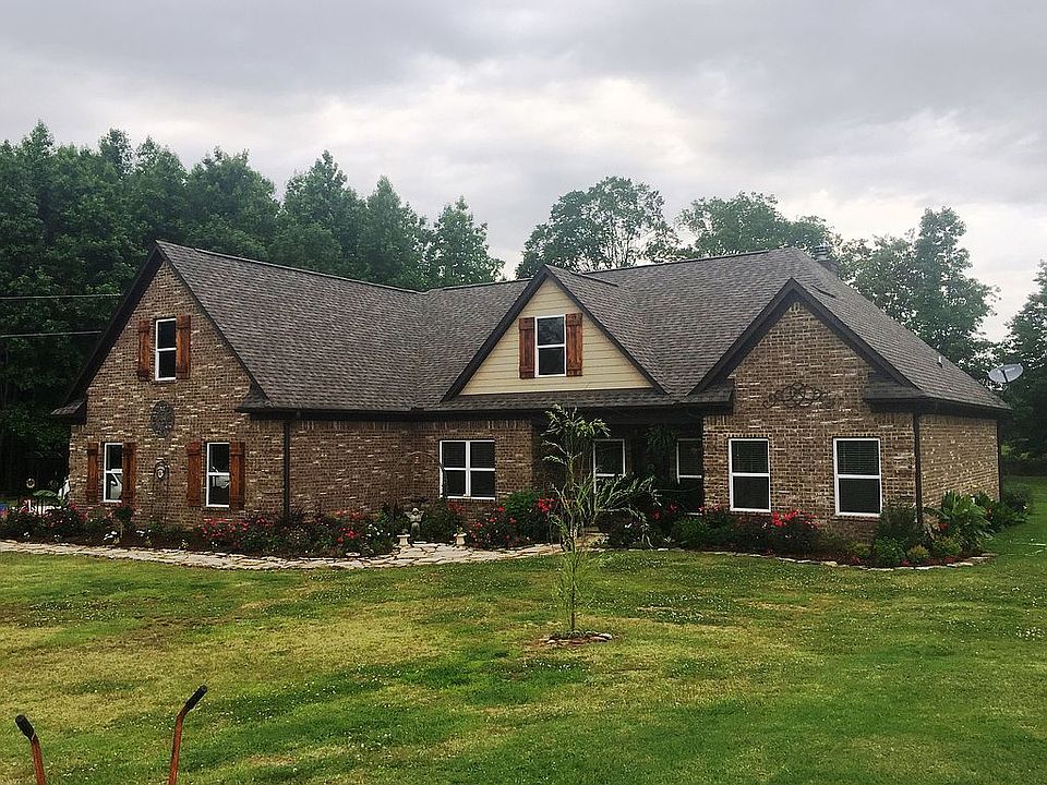 Custom brick and stone home, granite in kitchen and bathrooms, custom cabinets in kitchen, bathroom, and laundry room. Custom sliding barn doors and mantle in living room