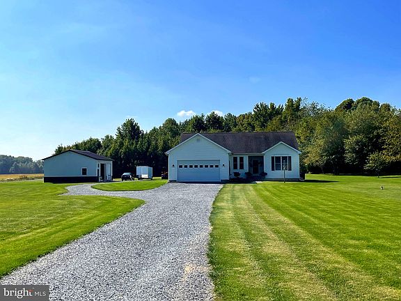 Eastern Shore Living at its Absolute Best! Meticulously maintained Three bedroom, Two bath one level ranch style home with attached two car garage on FIVE acres! Property also boasts a 32' X 28' Detached two car garage with a workshop, two 10' doors and concrete parking pad. The house has a split floor plan with eat in updated kitchen, large pantry and separate utility/laundry room. Cozy living room with propane fireplace and walkout to a 20' X 16' concrete patio; perfect for entertaining! Bright, large primary bedroom including a walk in closet and two sink primary updated bathroom with a walk-in shower. Wildlife and wooded trails abound on this property while still offering enough open space to bring your horses and other animals. Very close to Rt 301 for easy commuting. Camouflaged storage container conveys to allow for maximum use of the main improvements. Do not miss out of this one!