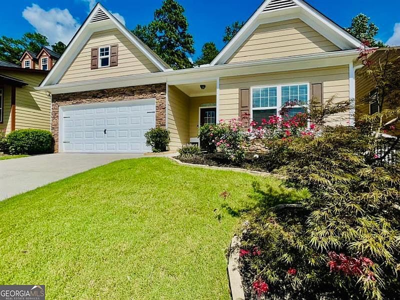 Welcome to this meticulously maintained 3-bedroom, 2-bathroom ranch-style home that perfectly blends comfort and style. As you step inside, you'll be greeted by an inviting open floor plan, ideal for both everyday living and entertaining. The spacious living area features a cozy fireplace, perfect for those chilly evenings, and flows seamlessly into a gourmet kitchen. The kitchen is a chef's dream, complete with granite countertops, a huge island for meal prep and gatherings, and top-of-the-line appliances. The master suite is a true retreat, boasting a large, luxurious shower and ample closet space. The additional two bedrooms are generously sized, offering plenty of space for family, guests, or a home office. Step outside to enjoy the fully fenced yard, offering both privacy and a safe space for kids or pets to play. The outdoor area is perfect for summer barbecues or simply relaxing with a good book. The community features amazing amenities including a clubhouse, large swimming pool, fitness center, playground, basketball, and walking trails. With its prime location and meticulous upkeep, this home is move-in ready and waiting for you to make it your own. Convenient to Canton, 575, and just minutes from Ball Ground, Jasper, Woodstock and surrounding areas to enjoy shopping and nature. Don't miss out on this rare opportunity-schedule a showing today!