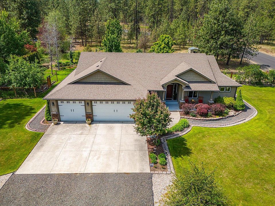 Discover a rare opportunity to reside in a lakeside community with new homes and no HOA. This meticulously maintained 3422 sq ft rancher is ideal for those seeking main level living and privacy on over 1 acre. Features include gleaming wood floors, granite countertop in the kitchen, stainless steel appliances, quality plantation shutters, and hickory cabinetry throughout. Cozy propane fireplace in the living room. The large primary suite includes garden tub, double vanity, and walk-in closet. 3 bedrooms upstairs and 2 in basement with family room. A covered back deck invites year round use, overlooking creatively landscaped gardens with perennial flower beds, a babbling water feature, and a grape laden trellis. Fenced garden with raspberries, strawberries and apple trees. Room to build a shop. Launch a boat nearby at Willow Bay. Meander around 281 acres of Lake Spokane Parks and Rec & WA DNR land. 5 minute drive to Suncrest community conveniences. Nine Mile Falls School District.