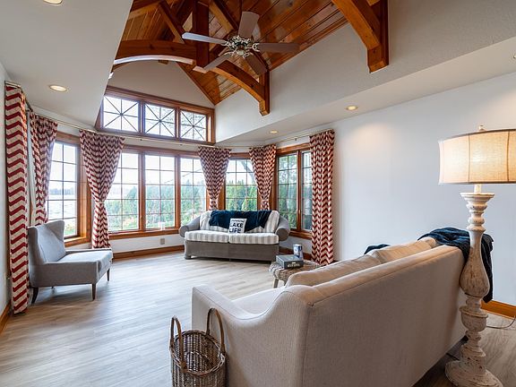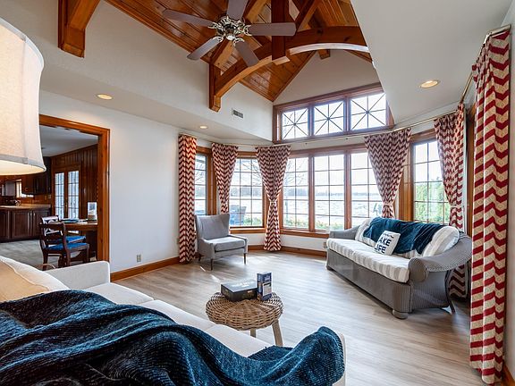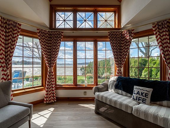 5 Lakes to enjoy All year Round on the Indian Chain, it's not easy to find 95 ft of total waterfront on Dallas Lake that includes a front & back lot!! This Cape Cod like property was a Custom Remodel & Addition by Architect Dick Terwilliger with unobstructed views on the widest part of the lake that makes this a prime location on Dallas Lake!! Stunning views from the deck/patio area and from the picture windows inside this lovely home where most rooms have lake & sunset views. 75 ft of Dallas Lakefront for the main home & 20 ft of waterfront on the back lot provide plenty of entertaining spaces. The Main house includes a large patio and enclosed manicured yard that leads to the sandy, gradual sloping beach for hours of fun & making memories. Inside the home you can sit back and enjoy watching the activity on Dallas Lake from your favorite spot. Some rooms have vaulted wood beamed ceilings, glass pained French doors, and architectural windows that take advantage of spectacular sunset and lake views. The Owners Suite has a large En suite with vaulted, wood beamed ceiling over the jetted tub, separate walk-in shower, and stackable laundry area. Arborvitae trees surrounding the lot, add to the charm & privacy of this home. The back lot includes a remodeled two-car finished Garage/Rec Room to use for yourself, extra guests or can be turned back into a garage if needed. The Rec room has French doors that lead out to a patio, fenced in yard, and additional 20 ft of channel frontage ideal for docking a boat. **New in 2023- low maintenance laminate flooring in most rooms, water heater, and New 2022 Geothermal HVAC system. Remodel & addition was done in October 1990 by Terwilliger Custom Homes, and a nostalgic painting of the original cottage is included in Bedroom 2. There is another bedroom, bathroom and office/bedroom for all of your guests. Great property for a year-round or seasonal home on the lake, with investment property potential.
