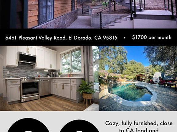 For Rent Entire guesthouse in El Dorado County, California. Cozy fully furnished 2-bed 1-bath private rooms on the top of the garage. The property is located less than 5 minutes from shopping, and 7-8 minutes from Downtown Placerville, CA food and entertainment areas. Your home away from home includes everything you need, including a fully equipped kitchen. Private rooms sleeps up to 4 guests. Appointed with luxury design, Second-floor of property, Open concept floor plan, dining room seats 4, and 65" flat screen tv. Two bedrooms, both bedrooms has 1 queen beds and in living room with folding leather couch. The kitchen is fully equipped with all the basics. Outdoor patio with table & chairs. Pets are allowed , with pet deopsit. $1700 per month, plust deposit and $200 for utilities
