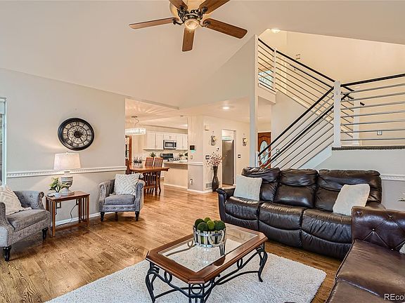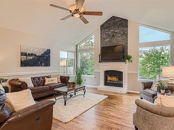 Nestled in Highlands Ranch, this Bright and Beautiful 3 Bedroom, 3 Bath Home beckons with its Lush Green Grass, Mature Trees, and Majestic Mountain Views. Step inside and be captivated by the Sunlit Picture Windows, Grand Vaulted Ceilings, and Elegant Oak Hardwood Floors that grace the main level. Cozy up by the Gas Fireplace set against a sleek black slate accent wall!