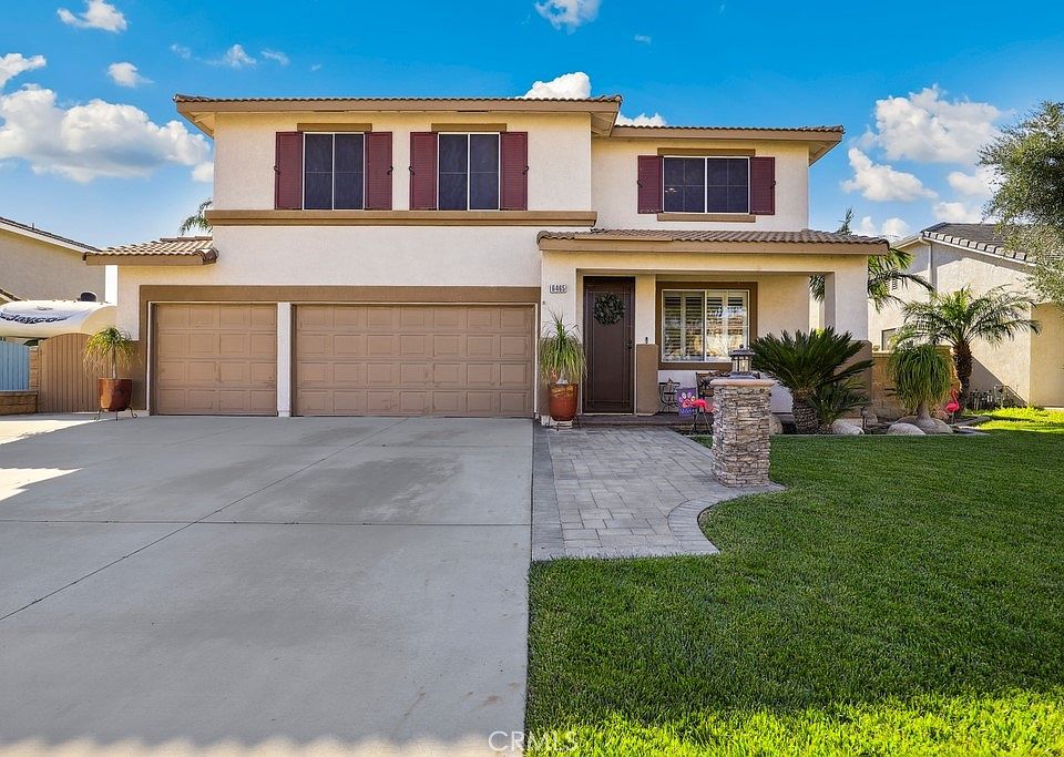 Move in ready 4 bed, 2.75 bath home is ready to be made yours and offers great curb appeal with well manicured landscaping and attached 3-car garage with room for RV parking! The interior is spacious and features gorgeous crown molding, a custom paint scheme, plantation shutters, recessed lights, Smart Home features including a Smart thermostat and doorbell, and the home also has carpet and tile floors. Enter into the formal living room and dining room which flow into the great room where the family area features a fireplace and media niche and the kitchen has been updated with beautiful wood cabinetry, granite counters, stainless steel appliances, and there is a center island with bar overhang. A bathroom with a walk-in shower completes the main floor. All of the bedrooms are located on the 2nd floor including the large primary suite with private ensuite offering a jetted soaking tub, separate shower, and dual sink vanity. There is also a full-size hall bathroom for the secondary bedrooms to share, and a laundry room with extra storage space. Enjoy the low maintenance entertainer's backyard with built-in outdoor cooking island with bar and BBQ, turf grass, a built-in fire ring, and the hot tub is included! There is also a dog park with real grass on the side of the home and a garden area with included shed for extra storage. This home also has gated RV or boat parking on the opposite side!