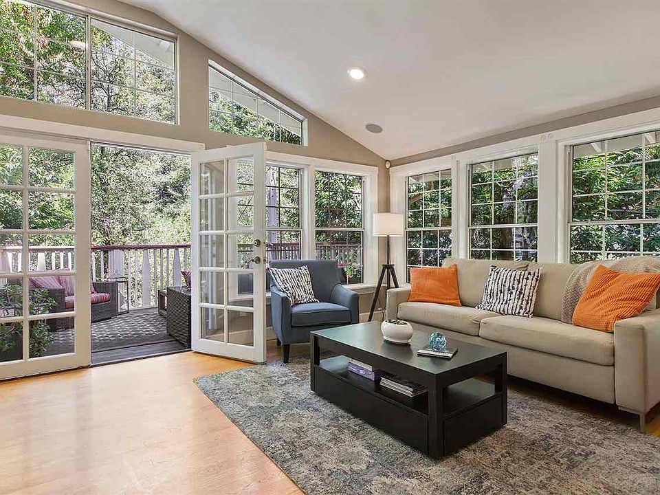 This tranquil hideaway is tucked into a canopy of trees. With a private footbridge leading over the Temescal Creek to the front yard, multiple decks, and an open concept floorplan, this slice of paradise is an entertainer's delight. This home features an open floor plan and offers sundrenched rooms with floor to ceiling windows. The main floor features a spacious kitchen that opens to a backyard with a deck, landscaped garden and grilling station for entertaining. Additionally, you will find one of the three bedrooms on the main level, which could act as a home office as well as a full bath just off the family room. Downstairs you will find the Master bedroom with private balcony, two large picture windows with a Jack and Jill large bathroom opening to the third bedroom. With an award-winning elementary school just a short ride down the hill, this home is where you'll want to settle in.