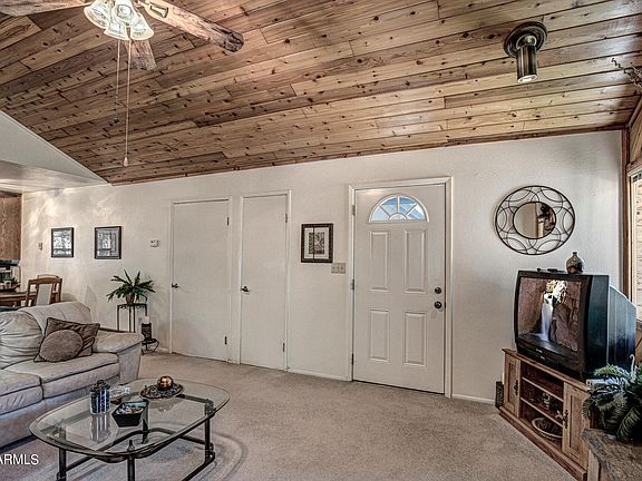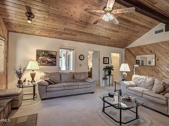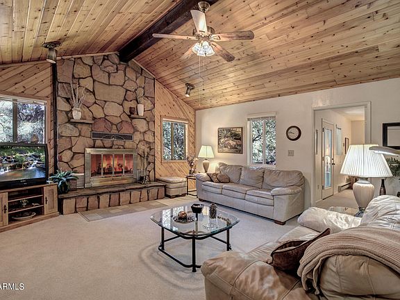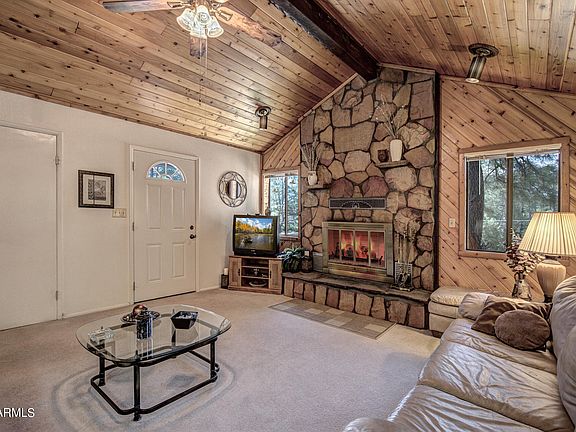 This charming home offers a welcoming great room featuring a striking cathedral ceiling and cozy fireplace crafted from native stone. The well-designed eat-in kitchen is perfect for casual dining and provides easy access to back deck and stunning screened, Arizona room 16' x 16'(not included in sqft), which also boasts a cathedral ceiling. This Arizona room is sure to become your favorite spot to relax and unwind. The split floor plan includes two spacious primary bedrooms, one with its own private deck, ensuring privacy and comfort. Additional amenities include a large insulated work shed (large enough to store golf cart) an oversized single-car garage, and a large two level front deck. The property features a beautiful paver driveway, parking area, sidewalk and stairs, adding to curb ap