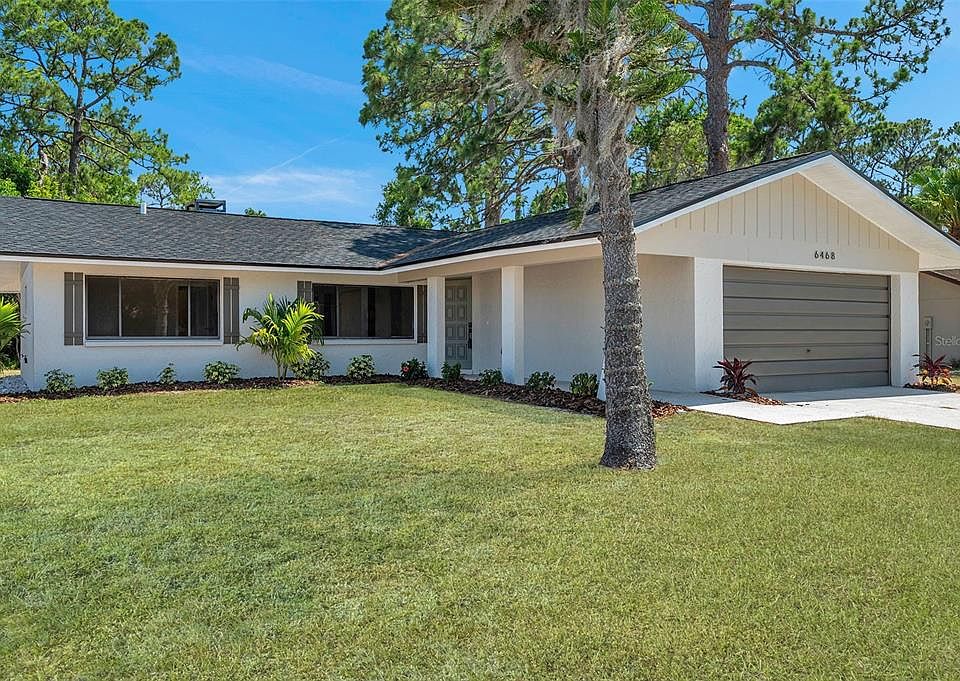 Beautifully updated 3 bedroom, 2 bath, 2 car garage home located on an oversized lot in Lake Sarasota. New Roof (2024). New HVAC (2024). No HOA - come park your boat/RV/toys on this huge lot! Driving up to this home you will admire the modern curb appeal with fresh paint and professional landscaping. Inside you will find vaulted ceilings throughout your large living area and formal dining room making it feel open and bright. Luxurious finishes inside include custom tiled entryway featuring built-in beadboard hook wall with bench seating, luxury vinyl flooring, 5" baseboards, fresh interior paint, shiplap accent wall, and modern fixtures throughout. Your eyes will be drawn to the focal point beautiful white stone fireplace which will be a centerpiece for entertaining. Kitchen has been tastefully modernized with custom shaker cabinets with crown molding, dazzling Grey Carrera Quartz counter tops, stainless steel appliances, vertical tiled backsplash, inviting breakfast bar and ideal closet pantry. Formal dining room showcases a custom modern wine wall display. Spacious Primary suite features walk-in closet, contemporary Quartz double sink vanity and separate water closet and shower stall with ribbon style tile surrounding your relaxing rainfall shower head. Split bedroom floor plan with ample sized guest rooms. Guest bathroom has mosaic design flooring, updated vanity, and shower/tub combo. Sliding door access to your screened lanai and huge backyard oasis - plenty of room for a pool with privacy! Lake Sarasota is a prime location located close to Top Schools with The Classical Academy of Sarasota opening minutes down the road! Close to I-75, St. Armand's Circle, Anna Maria Island Beaches, Cooper Hawk Winery, UTC shoppping/restaurants and more!