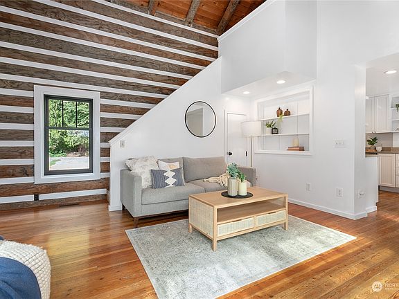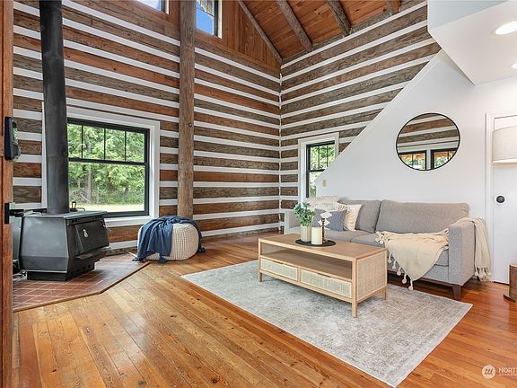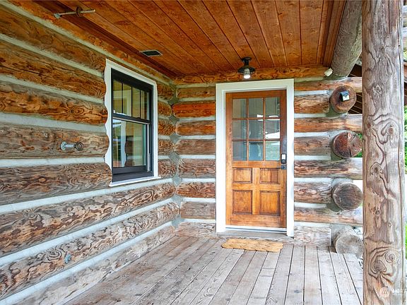 Stunning, one-of-a-kind, shy 7-acre property with a large covered deck that overlooks a private pond & a panorama mountain view. The beautiful log cabin features two bedrooms plus a loft, gorgeous vaulted ceilings, a 2nd deck off the primary bedroom, an updated kitchen and spacious bath, new light fixtures, a new range in '23, & tons of sun pouring in the new Anderson windows. The property features fruit trees, blueberries, currants, a serene willow tree grove, a mature treeline of evergreens for privacy on three sides, & an intimate trail from the southwest end of the circular driveway that leads you through the trees to a workshop, shed, & carport that are on a separate power meter. Only 10 minutes to Lynden & 15-20 minutes to Bellingham.