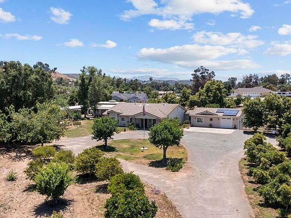 NO HOA and RARE find on 5.48 ALL useable + fenced acres w/ well + city water. The property features apx. 200 producing Hass avocado trees at a positive slight income, fruit orchard, apx. 50 ornamental trees, rose + rock/cactus garden. You will appreciate the LG det barn/workshop or future partial ADU conversion, horse paddocks + 4 covered shelters. The custom built home by John Vaughan features 6 BR /3.5 BA. You will appreciate the cov'd porch entry to living/dining room combo w/ dual paned windows + 9 foot ceilings throughout. The FR w/ skylight is enhanced by a brick fireplace w/ oval hearth, slider to rear cov'd patio + forever MTN views and cool breezes. The spacious kitchen features a center island w/ stainless steel sink, breakfast bar, breakfast nook, pantry +upgraded appliances. The master suite has upgraded carpet, walk in closet with built-ins, bath with inviting soaking tub, separate shower and dbl. sinks and slider to PVT rear patio. 2 bedrooms and office/4th bedroom w/ wood laminate floors are on 1 wing while the other two bedrooms with separate entry is on the other wing. Ideal for large or combined family with lots of room inside and out!!!