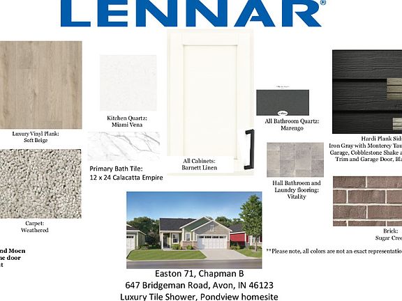Enjoy the resort lifestyle at Lennar at Easton in Avon, 55 and better community, part of the Easton Grey Riverwalk development! The Chapman, one story living, 1576 sq ft! Spacious Primary Bedroom with ensuite bathroom w/ Luxury Tile Shower and separate Walk-In Closet. Host game night in the main floor Study. Guests stay in the main floor extra bedroom. Unwind and entertain in the open concept Great Room, Dining area, and Kitchen featuring Lennar's Everything's Included with upgraded features throughout! Quartz Countertops, spacious kitchen island, LG Stainless Steel Kitchen Appliances. Relax on the back patio while all lawn care is taken care of as part of the monthly HOA fee! Future Nottingham Club House, swimming pool, lap pool, pickle ball courts, tennis court, gathering room and more. On-site Activities director and HOA manager. Purchase now and make plans to move-in in Aug/Sept! *Photos/Tour of model may show features not selected in home.