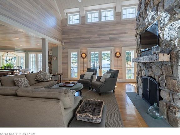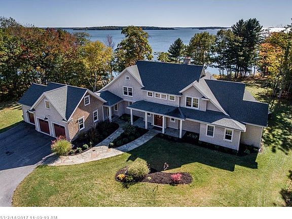 Situated on the rocky coast of Wolfes Neck, this elegant seaside shingle style home rests on 325' of ocean frontage. Extensive high-end custom finishes & water views hallmark this home. The gourmet kitchen & open floor plan provide a variety of comfortable gathering spaces. The commanding two story stone fireplace garners your attention surrounded by white washed poplar walls in the living room. The gracious lawn and patio provide dramatic waterfront views leading to the private deep water dock on Casco Bay.