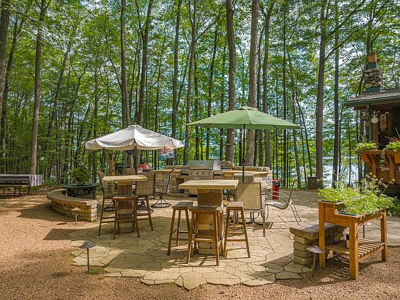 www.UpNorthRandR.info - Nestled on the west shore of Horsehead Lake, this property exudes Northwoods peace and calm, with 8.5+/- acres & 300' of sandy shoreline. Adjacent to State Lands! Recreational Zoned Property offers a multitude of uses and ownership options. Currently licensed as a resort for short term rentals. Property offers a recently remodeled 3 bed/2 bath year round main home featuring a WB fireplace on main floor & gas fireplace in the walkout lower level, leading to a lakeside barrel sauna. There are 4 add'l studio style 1 bed/1 bath seasonal cabins with kitchenettes, all with meandering patio paths through the woods leading to the property's focal point, a beautifully designed outdoor gathering space which features an outdoor kitchen & bar, firepit area, fish cleaning station, along with multiple sitting areas on landing areas leading down to the lake. 48'x40' pole building/garage and storage shed. Unique opportunity to experience the peace & serenity of the Northwoods.