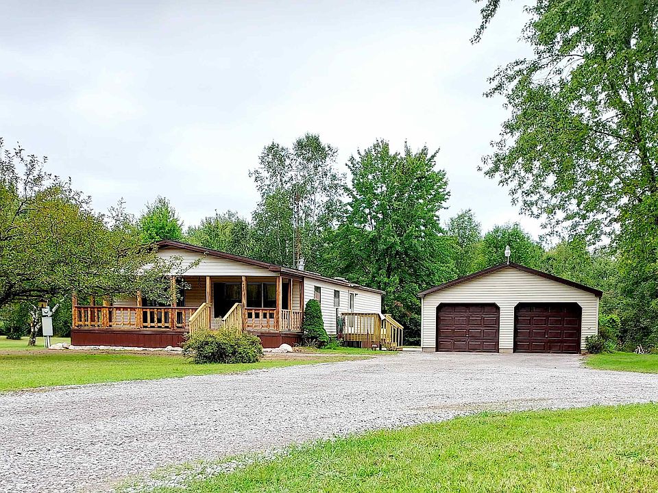 Very well maintained, move in ready Manufactured home on 10.5 acres. Black top road. Detached 24x 44 Garage. Two hunting blinds ready for the coming season. Crushed concrete driveway. Two decks for peaceful country sitting.