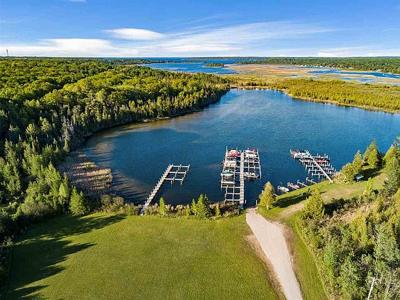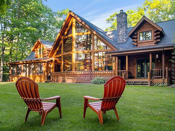 Live the Lake Marina Links lifestyle in this luxury log home with soaring 37' cathedral ceilings. Thoughtfully perched just above Indian River Golf Club's par three 13th green, you'll have an unbeatable view and access. Situated between Burt and Mullet Lakes with a private marina on the Indian River with an 'available' boat slip...this is the true trifecta of "Up North" living . Surrounded by mature trees and a soothing white pine interior, this is your retreat. From the minute you walk through the door, the view envelopes you; and offers up beauty, serenity and tranquility. Main floor living features a master suite and two additional guest bedrooms, a covered 'coffee' porch off the master and a 3 seasons porch off the guest bedroom, stone fireplace, 16 inch Italian marble flooring, custom Italian walnut bar and spacious first floor utility room. Entertaining is easy with stainless steel appliances, Viking cooktop, double dishwasher, outdoor fire pit, and don't forget the wine storage in the basement! Bring your RV and boat, the completely finished 3+ garage has 11' ceilings and room for all the outdoor toys. A protective portico connects the home and garage. Summer or Winter - you can ski out the back door to the cross-country trail - this is a true pleasure to enjoy year round. Marina and Golf Course memberships are optional, giving you control over the amenities you desire. Take them all - this trifecta is a winner!