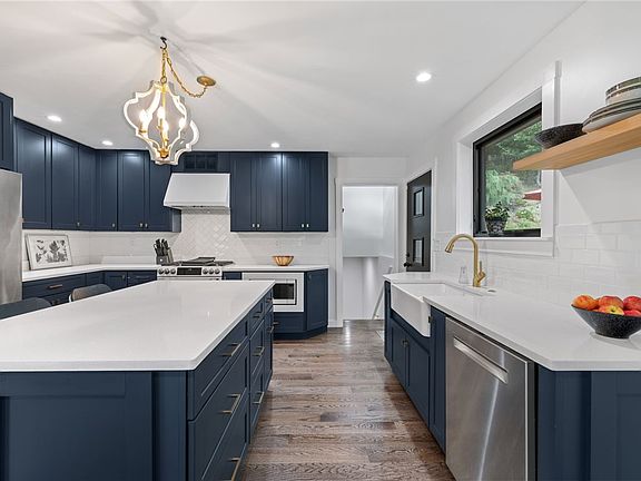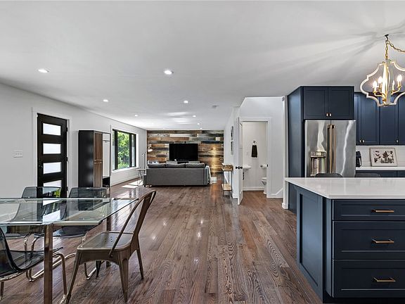 The main floor is flooded with natural light and offers a spacious living room, dining area, and half-bath. The eat-in kitchen boasts navy cabinetry, quartz countertops, and a blend of Cafe’ and stainless appliances. Hardwood floors throughout add warmth and charm. An additional family room, one level below, can flex as a home office, playroom, or gym.