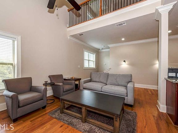 Prime location with easy access to major highways and walkability to the new Mercedes Benz headquarters! Well maintained private end unit boasts tons of natural light! Open-floor concept with upgraded kitchen includes granite counters, ss appliances and brand new refrigerator! Hardwoods throughout main! Master includes walk-in closet and double vanities in master bath! 2nd bedroom upstairs along with lofted space perfect for in-home office! Landscaped community includes swimming pool! Ample storage and closet space!