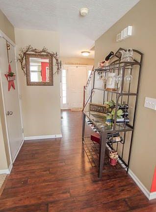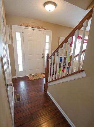 Enjoy privacy and solitude! This well maintained home backs to neighborhood greenspace/woods. The expansive great room overlooks the backyard, has a cozy gas log fireplace, accent lighting & walks out to a deck and faux stone patio. The hand-scraped wood laminate flooring stretches from the foyer, through the kitchen, & into the half bath & first floor laundry. The u-shaped kitchen features fresh white cabinetry, stainless steel appliances, & plenty of counter space. There is a flex room at the front of the home that could be a living room, formal dining rm, or office. Upstairs are 4 large bedrooms including a master suite with luxurious bath with jetted tub, shower, neutral decor & walk-in closet.