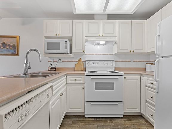 Top floor unit! Rarely available spacious and bright. Big 1 bedroom with lots of storage, a skylight and extra windows on the quiet side of the building with nice easterly views! Updated with vinyl flooring, immaculate and ready to move in. Conveniently located steps to transit and shopping. Well maintained, friendly building with a pro active strata.