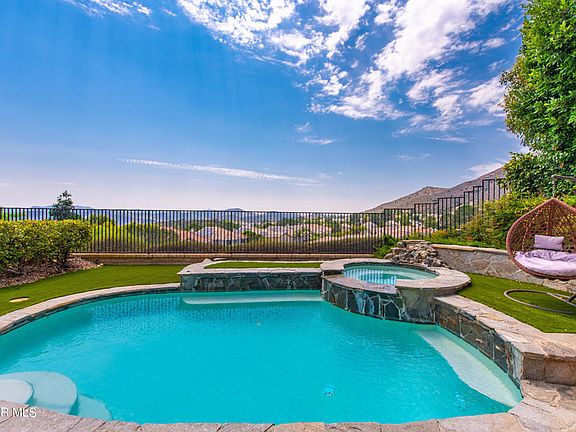 LOWEST PRICE IN REGENCY OAK PARK DEVELOPMENT! Step into your dream 4/5 bedroom pool home in Oak Park, where breathtaking mountain VIEWS and terrific amenities await. This single-family home offers the perfect blend of comfort and elegance, starting with an inviting backyard oasis featuring a sparkling pool, spa, and a lush grassy area with low-maintenance artificial turf. Entertain guests on the covered patio with an electric retractable awning, or cozy up around the gas fire pit as you soak in the serene surroundings. Inside, the open-concept living and dining rooms flow seamlessly, creating a welcoming space for gatherings. Woodlike flooring throughout the home. The spacious family room, complete with automated shades, fireplace, and walkout to the backyard, is ideal for relaxing while enjoying stunning sunset views. The updated eat-in kitchen is a chef's delight, boasting great views, a breakfast bar, stainless steel appliances, quartz countertops, deep pantry, and easy access to the backyard for al fresco dining. Downstairs office is perfect for working from home or working out. There is also a downstairs bedroom with a private full bathroom ensuring convenience for guests or family. Upstairs, the expansive primary bedroom features a private balcony, where you can savor the mountain vistas. This suite has been thoughtfully expanded, converting an additional bedroom into a spacious closet - easily reversed if desired. The primary bathroom offers dual vanities, two large closets, a soaking tub with picturesque views, and a separate shower. Two additional upstairs bedrooms are nicely sized, sharing a hall bathroom with an oversized vanity and a separate tub/shower combination. A two-car attached garage provides ample storage and parking. This home is all about the views and a backyard perfect for entertaining and enjoying life. Imagine hosting friends and family, creating memories in your private sanctuary. Welcome home to Oak Park, where every day feels like a retreat with award-winning schools, parks, and nearby hiking trails.