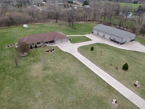 This custom built brick ranch home sits on almost 4 acres of quiet, tree-lined land with 400' of creek running through. The 50'x96' shop has 3 units with storage in the lofts of every unit, and two nicely finished rooms for offices or party space. All units are heated or have the option for a heater, floor drains and automatic garage doors in each one. This spacious home leaves little to desire- with high ceilings, surround sound throughout, huge closets, and beautiful views of every sunrise. Wet bar and movie theatre in basement. Second attached 15'x15' garage for even more parking storage.