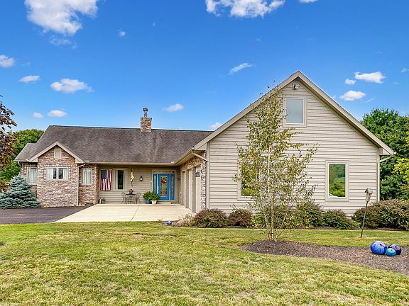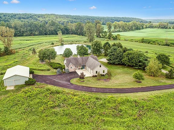 Beautiful custom built home sitting on 20 rolling , beautifully landscaped, acres! The house features 2 Geo-thermal units and propane back ups, plus a whole house generator. The kitchen and LL bar is Silestone Quartz, custom solid cherry cabinets. Upper level flooring is solid hickory and American Olen tile. The Lower level is engineered hickory hardwood and American Olean tile. The Florida Room is tile and windows that overlook the back of the home and 5/6 acre pond. The Owners suite is large and faces the back of the home. The Owners' bath is recently updated in 2021. It features handmade tiles from Talavera Pottery and hammered copper sinks. The lower level has two additional bedrooms, an office and a craft room. It opens to a large patio. The pole barn was built in 20