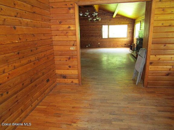 Nice older log home, large corner lot, across from the High School, one level, partial finished basement, 3 bedrooms, 1.5 bathrooms on the main floor, beautiful wood walls, ceilings and floors, no appliances, new kitchen floor, new furnace, old fireplace needs some repairs, nicely treed, attached 3 car garage, large lot, in town, , short distance to highway 95.
