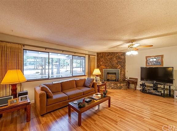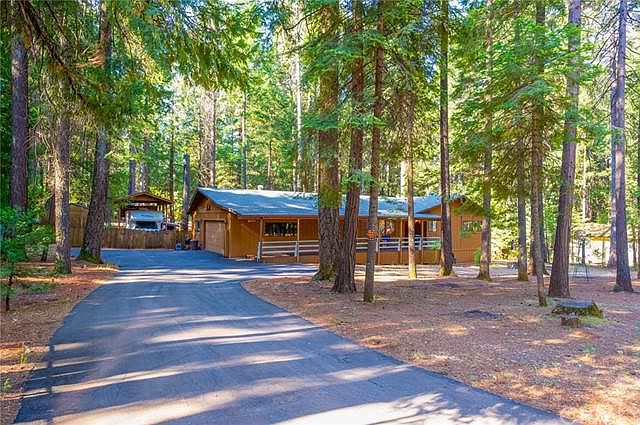 Welcome to this immaculately maintained, custom home in the pines! This home boasts pride of ownership at every turn. Featuring 2 bedrooms, 2 bathrooms, and large den with a closet, this home is sure to please. Upon entry through the solid-wood double doors you are welcomed into the spacious entry, with a generously sized hall closet. To the left is the living room offering newer laminate, and a floor to ceiling rock fireplace with a gas insert and a blower. Off the living room is the large den with bay windows, and the dining area with a slider to the enclosed back porch. The kitchen offers tile countertops, an electric stove (with propane stubbed for an easy conversions), and built in oven. Through the kitchen you will find a large laundry room, with tons of storage with both gas and electric dryer hookups. Down the hall is the guest bathroom with solid surface countertops, a soaking tub, and large window with a view of the backyard. Each bedroom is generously sized with ample closet space, including a large walk-in master closet. The master bathroom also offers solid surface countertops, with a step-in shower and custom built-in cabinetry. Additional amenities include dual pane windows, 60' covered front porch, gutter guards, a 2 car garage, AND covered RV parking (10'x30') with FULL HOOKUPS!