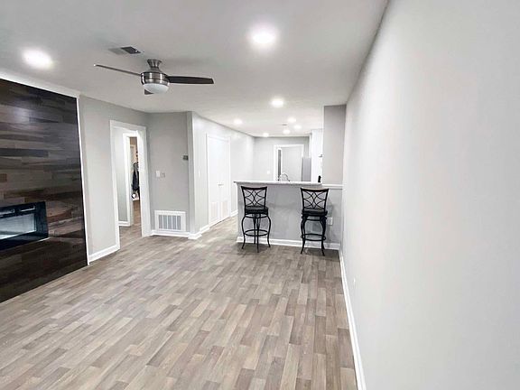 Open floor-plan with a flat screen TVs and modern fireplace wall feature.