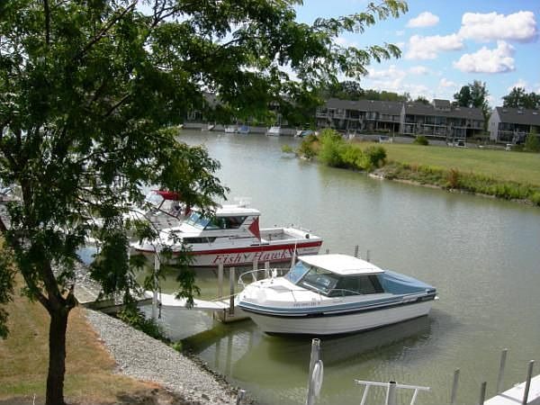 Two 30' docks come with this waterfront,unique style 2 bedroom, 2 full bath condo. A great view and you are less that a minute to Lake Erie by boat. Three minutes by foot. In the ground pool and a beach for your enjoyment. Two carports, 2 storage areas,with a large kitchen and newer appliances. Located on the water with an enclosed sun room and an oiutside deck. The best of both worlds.