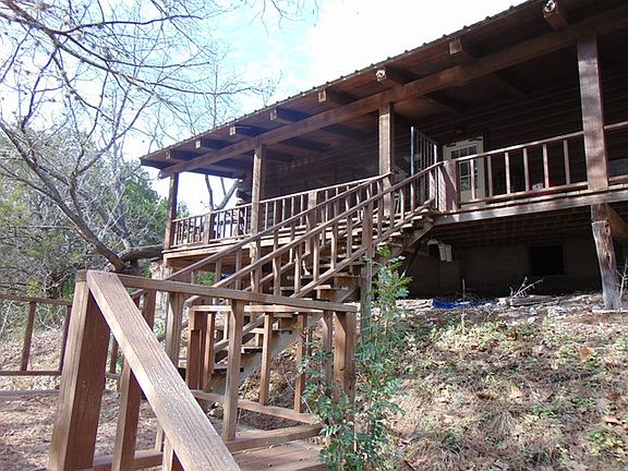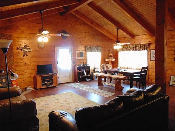 Here is that Log Cabin in the Hills with great water frontage and that relaxing view off the back porch, Property has little over 5 acres to offer with no restrictions, Cabin exterior recently has been stained and updated bathrooms. Property also offers a fenced yard for your pets. Cabin has a really nice porch full length of the house with staircase to deck down to waters edge, metal roof, vaulted ceiling in the living area, with a nice wood burning free standing fireplace. Great place for canoeing, fishing, swimming, and overall recreational activities.